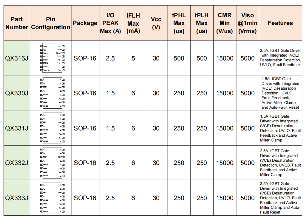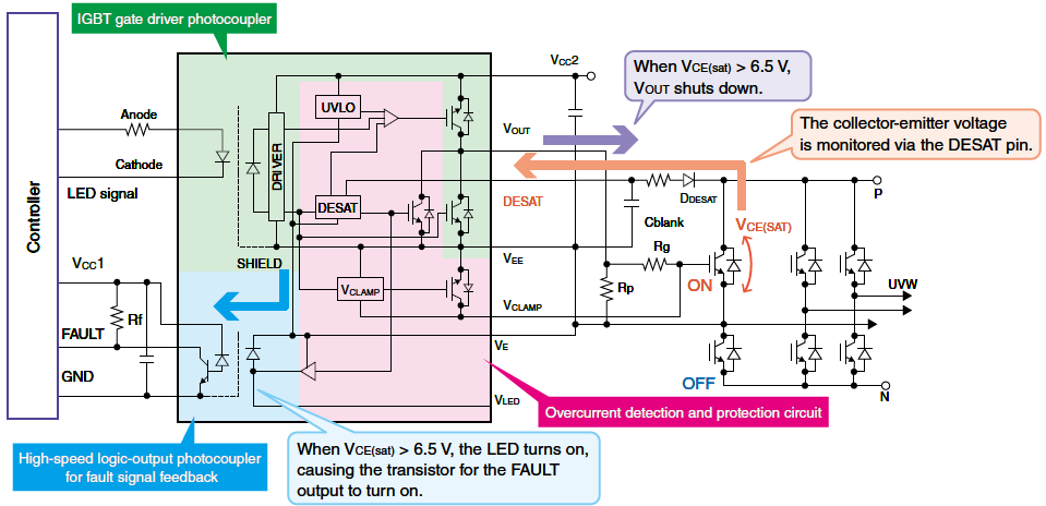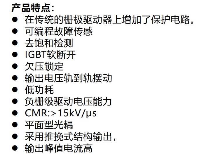 智能型栅极驱动光耦指的是在一般驱动光耦具备栅极驱动功能以外,还具有欠压闭锁反馈、退饱和检测、以及反馈等功能。IGBT/SiC的功率越